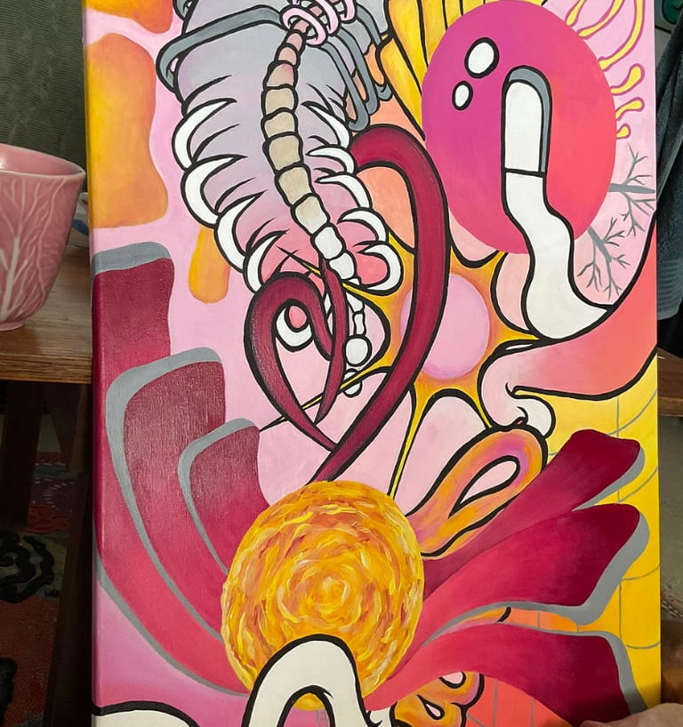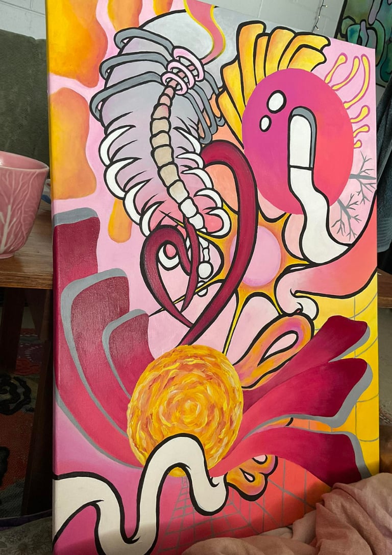 My pieces explore themes of inner healing, spiritual evolution, sexual energy, and the mysterious architecture, the quantum matrix of consciousness & creation, sometimes through the lens of nature, sometimes through futuristic dreamscapes with robotic beings and glitchy simulations. Maybe we’re in a dream. Maybe we’re in a loop. Either way, I paint the mirrors, abstract of nature and you reflect your own inner world within them.
